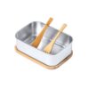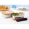 Lunch box en acier inoxydable avec couvercle en bambou naturel. Avec set de couverts en bambou (couteau et fourchette) et sangle élastique, 600 ml. Matieres : : Acier inoxydable , Bambou . Passe au lave-vaisselle : Oui Passe au micro-ondes : Non.