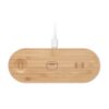 Station de charge 3 en 1 en bambou. Elle comprend un chargeur sans fil 15W, un chargeur pour smartwatch (Apple® uniquement) et un chargeur TWS.