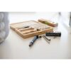 Ensemble d’outils en mĂ©tal de 21 pièces dans une boĂ®te en bambou. Comprend un tournevis Ă douille, un coupe-papier, trois tournevis de prĂ©cision, un jeu d’embouts de tournevis de 10 pièces dans un support, un jeu de douilles d’Ă©crous de 4 pièces et une rallonge. Matieres : : Bambou , MĂ©tal.