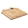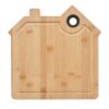 Planche à découper en forme de maison en bambou avec rainure et trou de suspension. Le bambou est un produit naturel, et présente de légères variations de couleur, de décoration et de tailles.