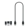 Câble de chargement 3 en 1 avec différents connecteurs. Présenté dans une boîte en bois d’acacia. Câble Type-C vers Type C, C vers USB-A, C vers micro-B, C vers connecteurs Lightning.