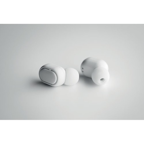 Oreillettes stéréo sans fil (TWS) 5.3 en ABS recyclé avec microphone et batterie 40 mAh intégrée. Durée d’écoute d’environ 4 heures. Appairage automatique. Câble de charge micro USB et station de charge 300 mAh inclus.