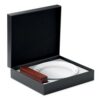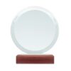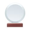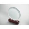 Trophée ou plaque commémorative en cristal rond sur une base en bois de hêtre dans une boîte cadeau.