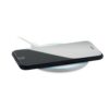 Chargeur sans fil en aluminium 10W avec verre sur le dessus. Lumière bleue lors de la charge. Sortie : DC 9V/1.1A. Compatible avec les derniers androïdes, iPhone® 8, X et plus récents.