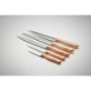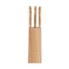 Set de couteaux en bois. Comprend un support de base et 5 couteaux : Chef, à pain, à trancher, multifonctionnel et à éplucher. Acier inoxydable avec manche en bois.