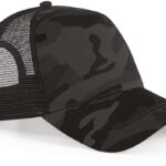 Panneau frontal et visière 100% coton. Panneaux arrière en maille filet 100% polyester. 5 panneaux. Visière préformée. Motifs camouflage. Ajustable par languette de réglage rétro Snapback. Étiquette détachable.