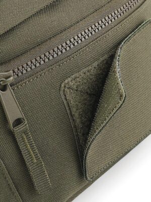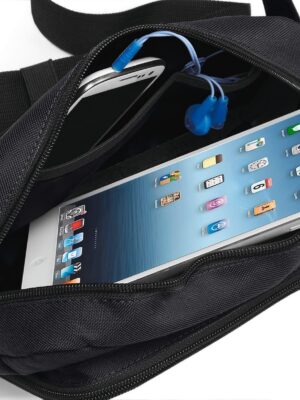 Polyester 600D. Ceinture ajustable avec fermeture sécurisée. Poche arrière zippée. Grand compartiment principal à fermeture zippée.