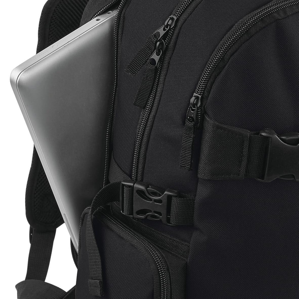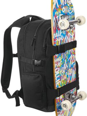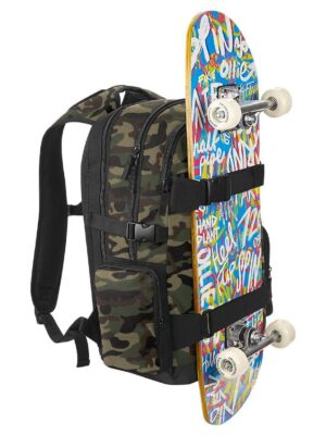 Polyester 600D. Étiquette détachable TearAway. Compatible avec les ordinateurs portables jusqu’à 17″. Compartiment matelassé pour ordinateur portable avec accès externe. Organisateur interne. Sangles de maintien. Poche frontale zippée. Poches latérales zippées. Dos matelassé. Bandoulières matelassées ajustables. Sangles de transport pour skateboard. Poignée de transport.
