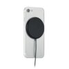 Chargeur sans fil magnétique en ABS. Sortie : DC 9V/1.1A (10W) pour une charge rapide. Comprend un anneau métallique magnétique supplémentaire pour prendre en charge la charge d’autres téléphones non magnétiques rechargeables sans fil.