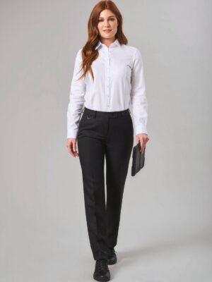 100% polyester superfin. Pantalon droit, passants et porte-clefs, 2 poches avant, 2 fausses poches arrière (livré en “bas non-terminé” – longueur : 91.5cm). Tissu performant : test pilling 4/5 et test de Martindale : 100,000 frottements sans casses. Lavable en machine à 40° ou nettoyage à sec!