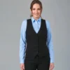 100% polyester superfin. Gilet 5 boutons et 2 poches, avec dos en satin réglable. Tissu performant : test pilling 4/5 et test de Martindale : 100,000 frottements sans casses. Lavable en machine à 40° ou nettoyage à sec.