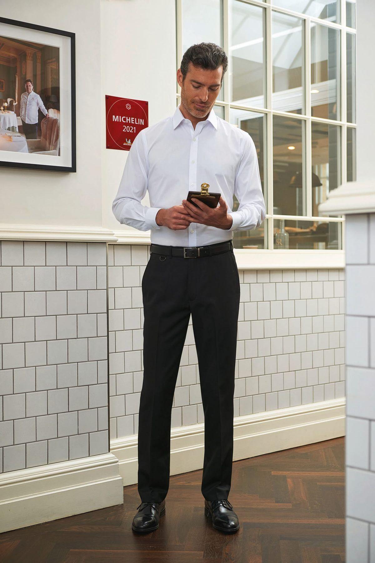 100% polyester superfin. Pantalon sans pinces, coupe ajustée, 2 poches avant, 1 poche arrière, passants et porte-clefs (livré en “bas non-terminé” – longueur : 91.5cm). Pas d’ourlet en bas de jambes. Tissu performant : test pilling 4/5 et test de Martindale : 100,000 frottements sans casses. Lavable en machine à 40° ou nettoyage à sec!