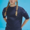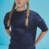 80% coton pré-rétrécin Ring-Spun / 20% polyester récyclé. Col rond. Manches montées et épaules tombante. Poignets classiques et ourlet inférieur en côte élasthanne 1×1. Coutures latérales.