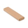 Boîte en papier recyclé contenant 3 crayons taillés, 1 taille-crayon en bois, 1 gomme et 1 règle en bois.