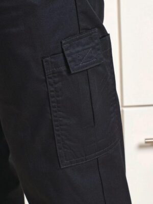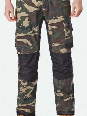 98% coton / 2% élasthanne. Braguette avec zip YKK. Triples coutures. Nombreuses poches dont une poche cargo avec compartiment pour téléphone portable et une poche mètre. Boucle pour marteau. Taille élastiquée. Poches pour genouillères en Cordura®.