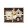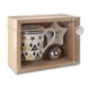Ensemble de tasses en céramique, dont tasse, filtre à thé et soucoupe. Présentés dans une boîte en carton avec film en PVC, cordon et étiquette.
