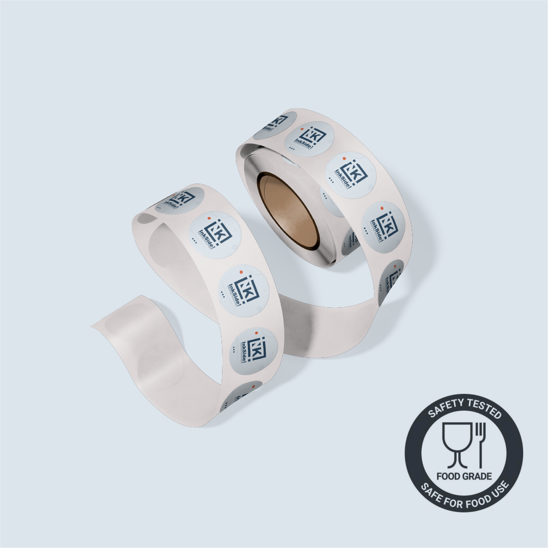 Une étiquette personnalisée, en couleur, en rouleau, que vous pouvez coller directement sur les aliments avec ou sans étiqueteuse. Par exemple, si vous souhaitez ajouter des informations nutritionnelles à votre contenu, des prix ou même un code-barres. Ces étiquettes alimentaires ont une colle sans danger pour les aliments et sont conformes au règlement européen n° 1935/2004/CE pour les denrées alimentaires.