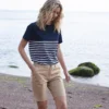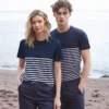 100% coton jersey. T-shirt épais à manches courtes, coupe classique sans étiquette. Col rond avec encolure côtelée extensible. Ourlet et couture des manches en double surpiqûre. Motif de couture plate en forme de « V » au niveau de l’encolure. Coutures plates au niveau de l’encolure, des épaules et des emmanchures. Couture sur le haut de la poitrine. Partie inférieure rayée contrastant avec le haut du corps et les manches unis.