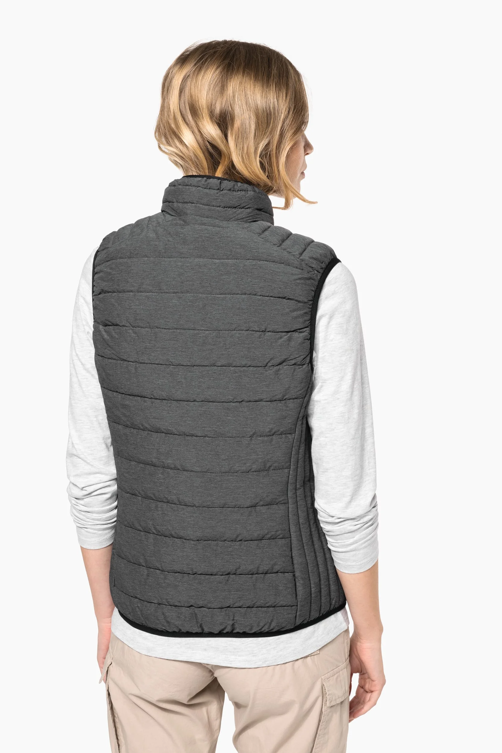 100% polyester recyclé. Gilet zippé avec panneaux sergé contrastés cousus à plat. Poche poitrine avant avec fermeture à glissière et poches latérales passepoilées avec fermeture par boutons-pressions.