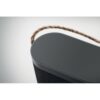 Enceinte sans fil 5.3 en ABS avec finition en tissu polyester RPET et chargeur sans fil 15 W en bambou, avec poignée en jute. 1 batterie rechargeable Li-Ion 1200 mAh. Données de sortie : 5 W, 4 Ohm et 5 V. Durée de lecture environ 4 h.