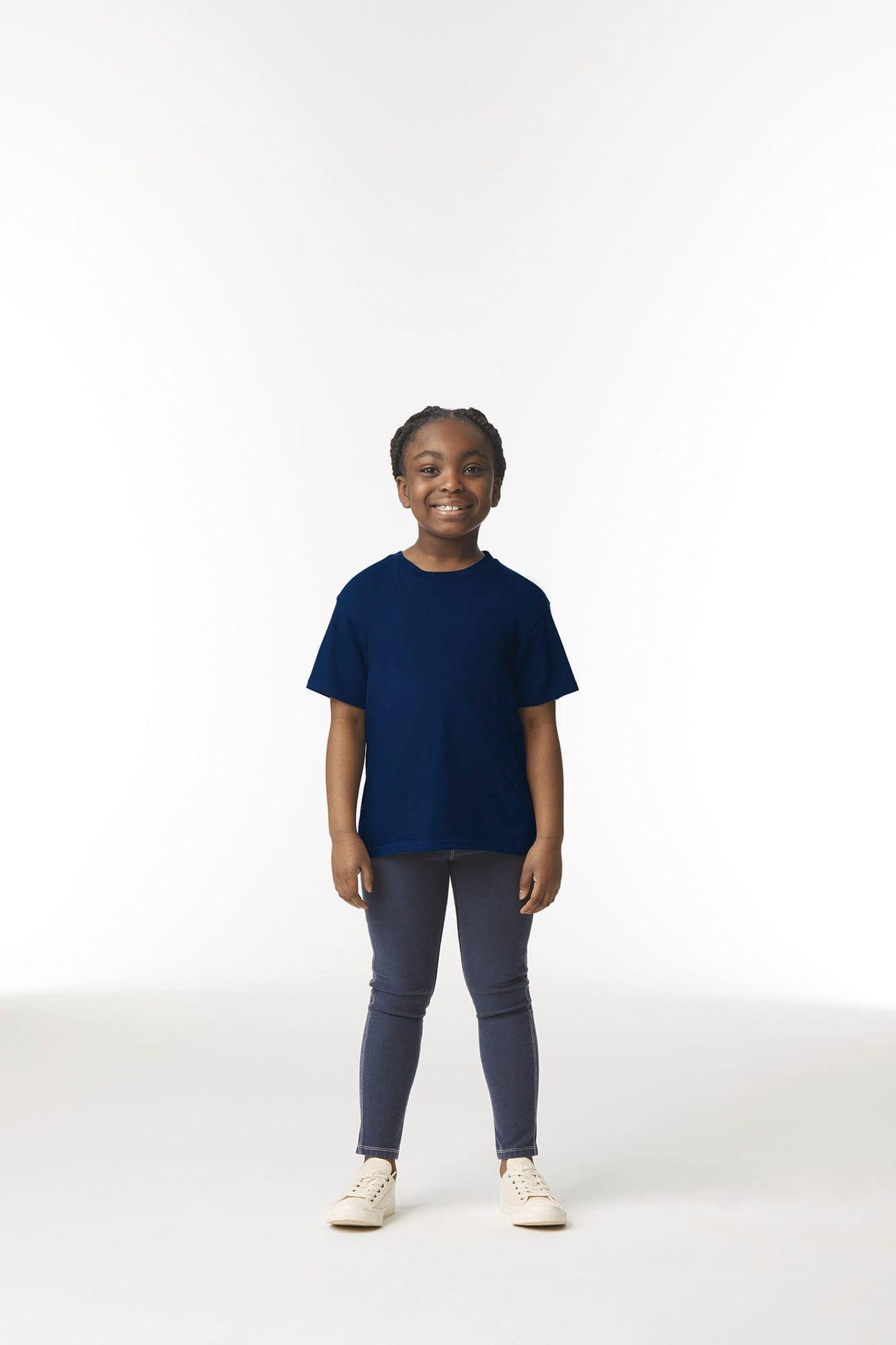 100% coton ring spun pré-rétréci Ring-Spun “Softstyle” (sauf RS Sport Grey : 90% coton / 10% polyester). Bande de propreté. Maille jersey. Double couture aux manches et au bas du vêtement. Conception tubulaire pour les tailles 7/8, 9/11 et 12/14 ans et coutures sur les côtés pour les tailles 3/4 et 5/6 ans. Coupe européenne.