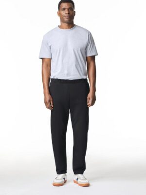 80% Coton Ring Spun / 20% Polyester. Ceinture élastique recouverte de cordons plats internes de couleur assortie. Poches latérales inclinées. Coupe classique, avec jambes fuselées et poignets élastiques.