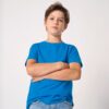 Coloris unis : 100% coton. Coloris Ideal Ash Heather : 99% coton / 1% viscose. Coloris Ideal Oxford Grey : 90% coton / 10% viscose. Maille jersey coupé-cousu de la taille 1/2 jusqu’à 6/8 et tubulaire de la taille 8/10 jusqu’à 12/14. Coupe droite. Col rond finition bord côte 1×1 avec double surpiqûres. Bande de propreté intérieure col ton sur ton. Ourlets bas de manches et bas de vêtement finition double aiguilles. Etiquette de marque détachable.