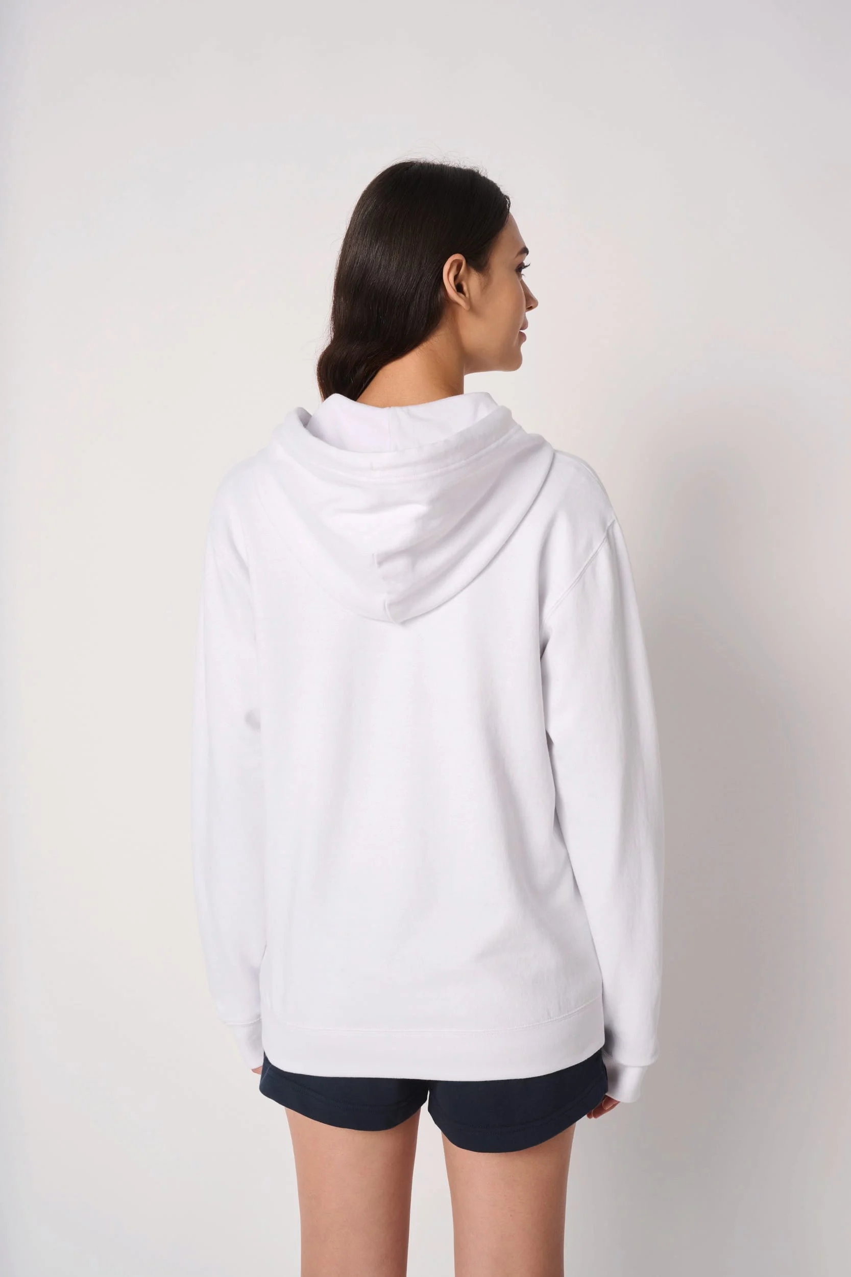 50% coton / 50% polyester. Molleton gratté tubulaire. Coupe droite. Bas de manches et bas de vêtement finition bord côte 1×1 avec double surpiqûres. Poche kangourou. Capuche doublée en jersey avec cordon de serrage rond ton sur ton. Etiquette de marque détachable.