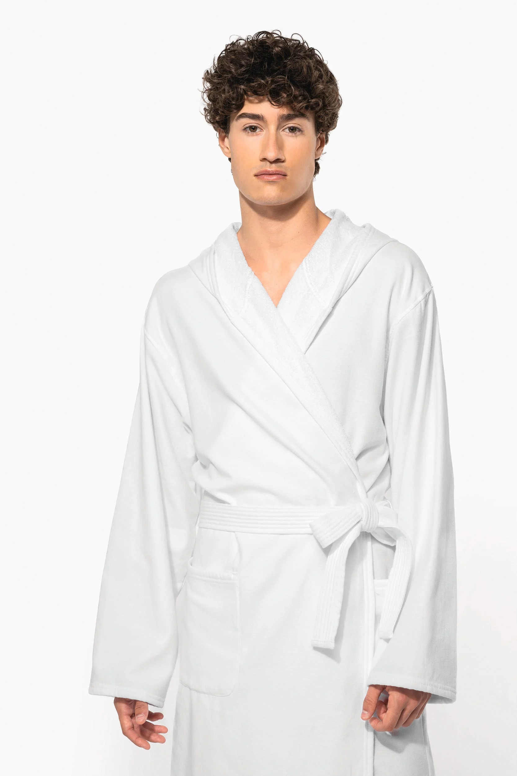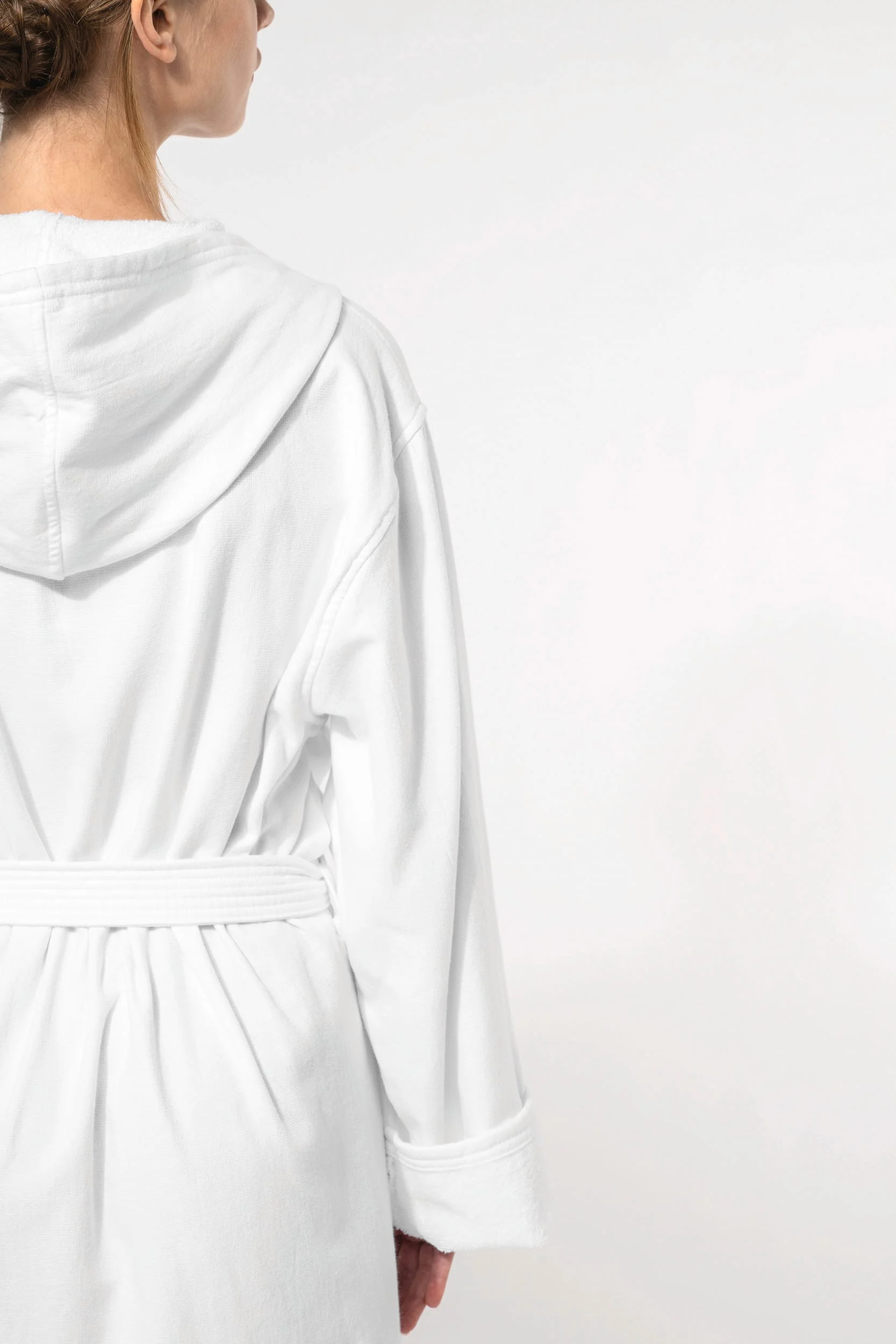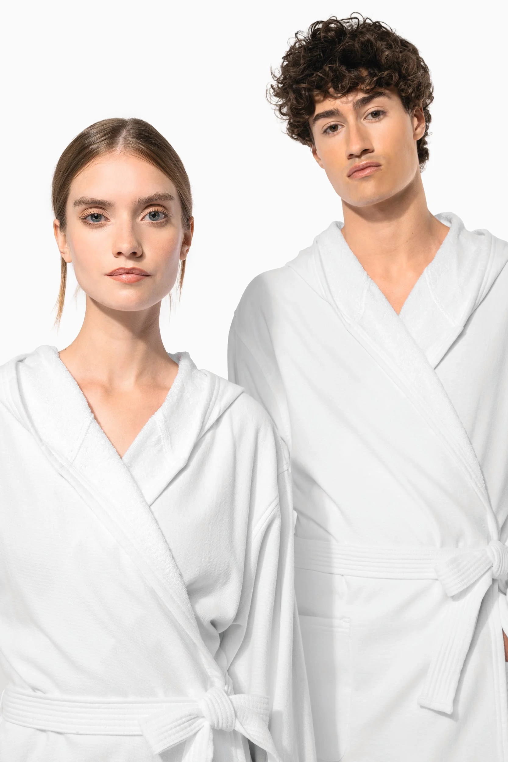100% coton biologique. Maille Terry. Toucher agréable et doux. Grande capuche. 2 poches côté plaquées avec surpiqûre de renfort en haut de poches. Ceinture avec passants. Lien d’accrochage dans le col. Finition double aiguille bord capuche, bas de manches et de vêtement. Finition tubulaire à l’ourlet bas et bas de manche.