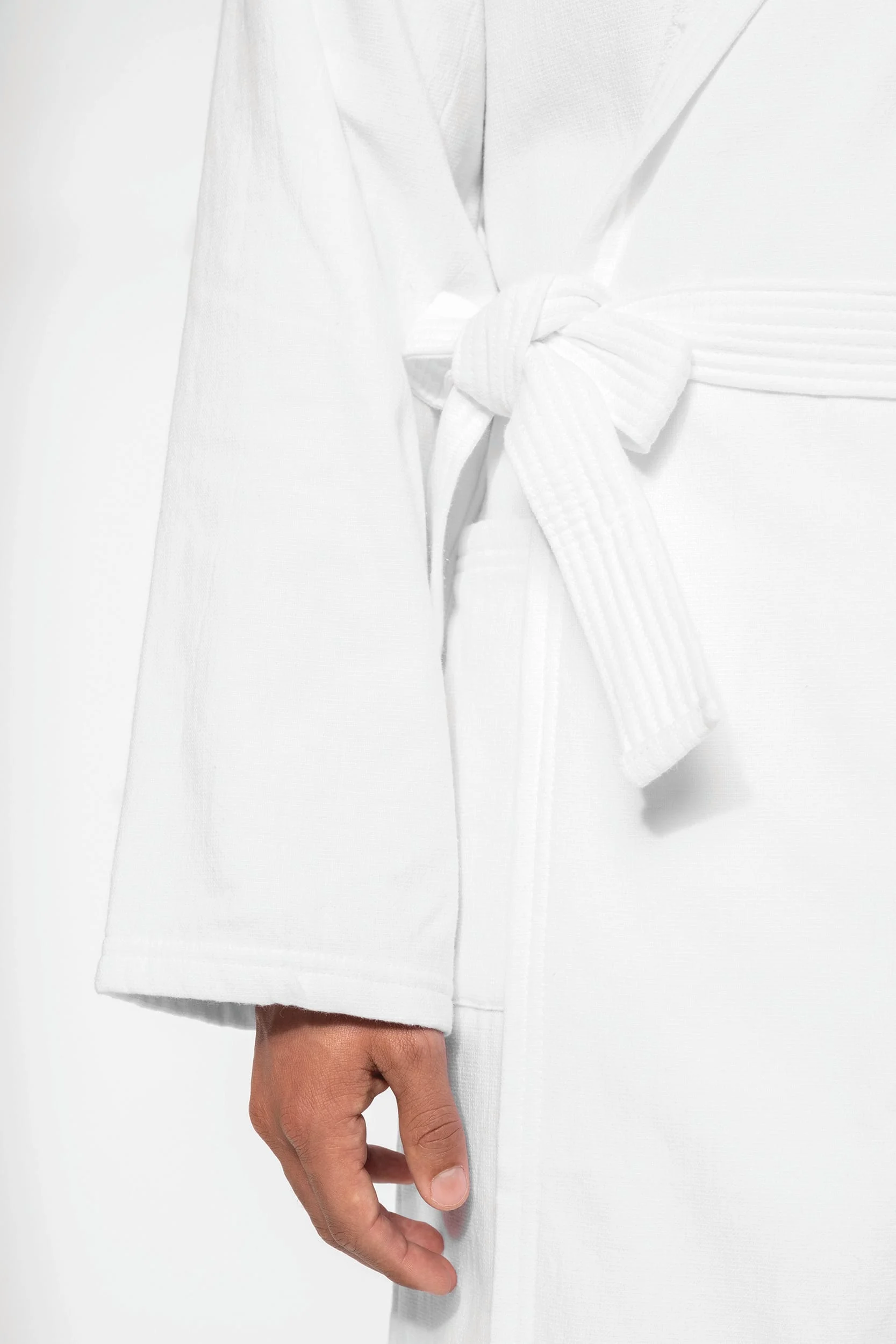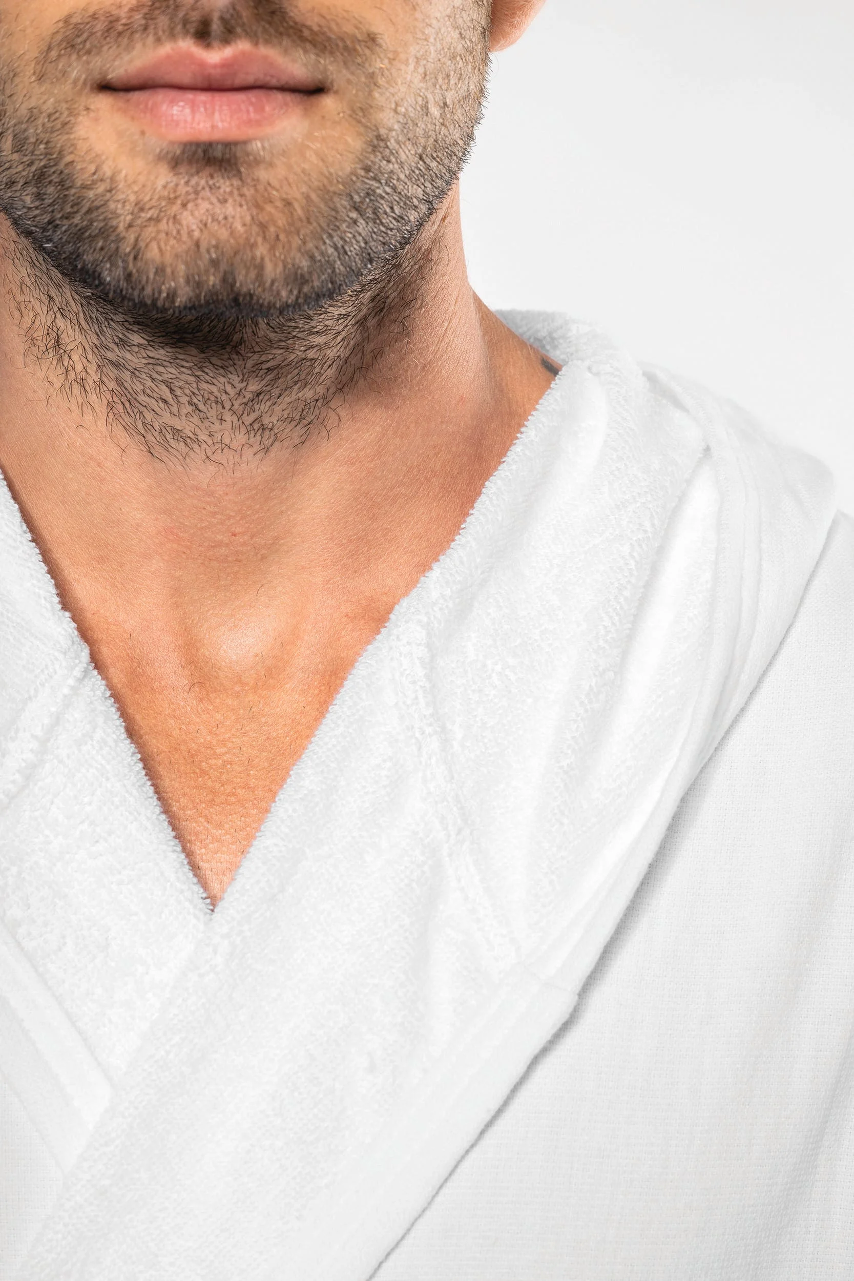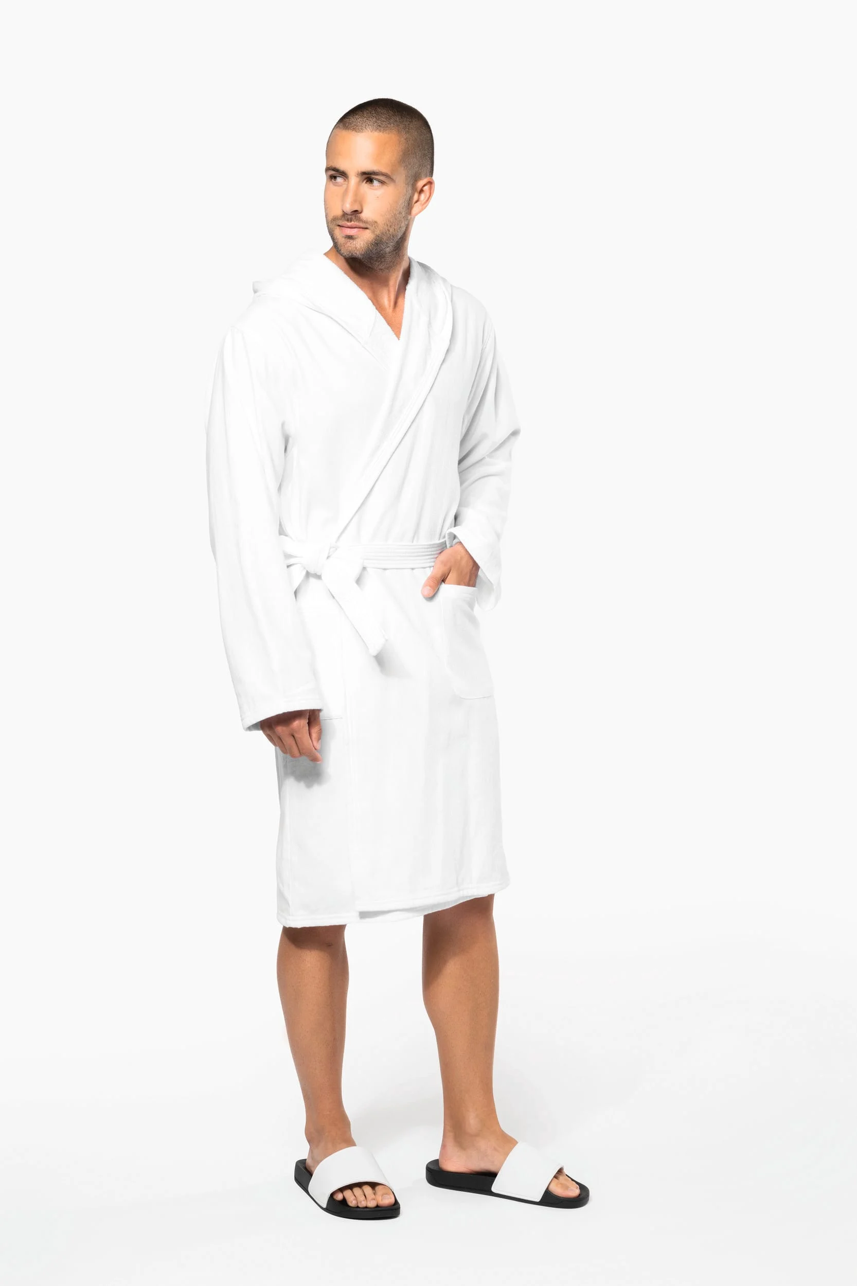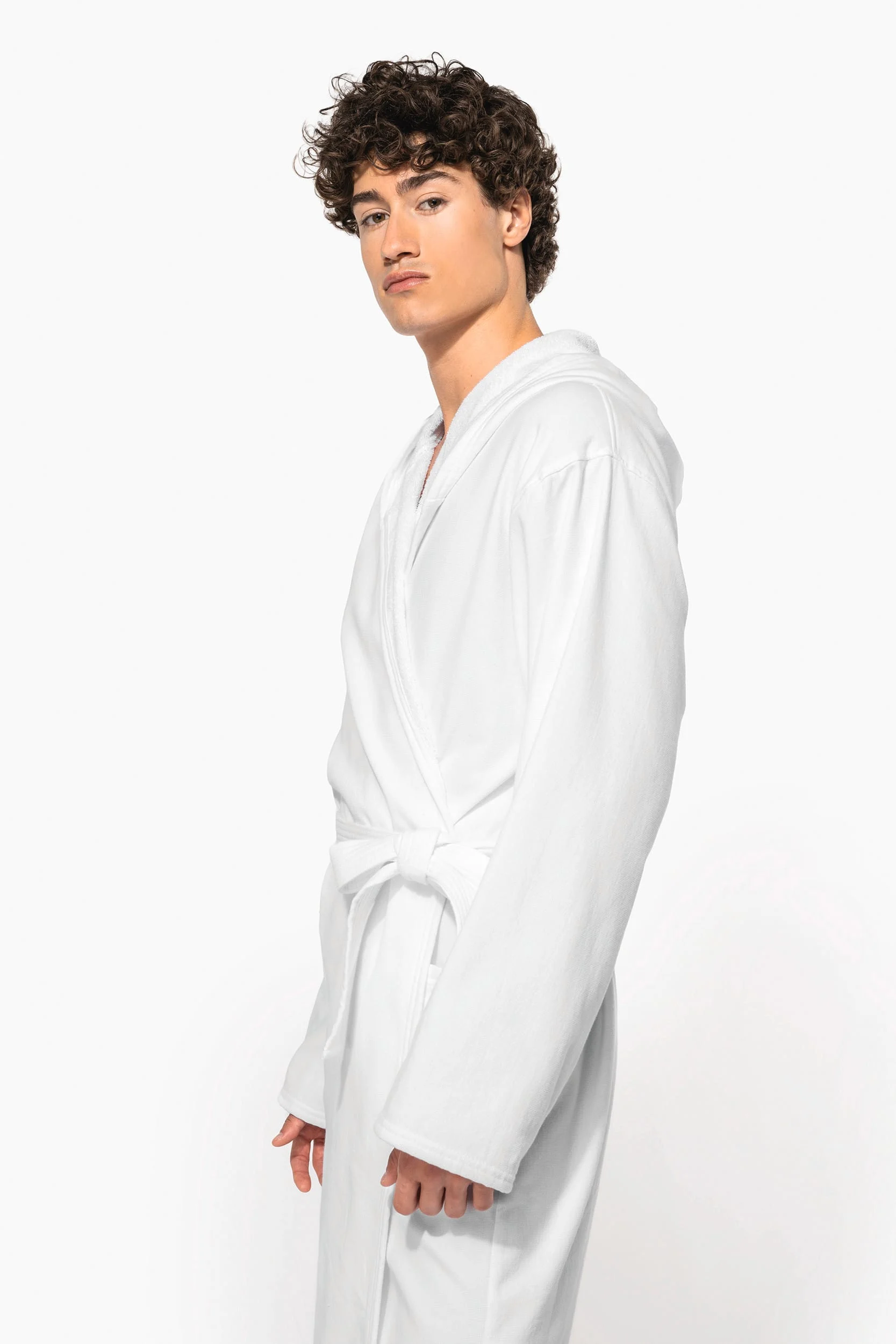 100% coton biologique. Maille Terry. Toucher agréable et doux. Grande capuche. 2 poches côté plaquées avec surpiqûre de renfort en haut de poches. Ceinture avec passants. Lien d’accrochage dans le col. Finition double aiguille bord capuche, bas de manches et de vêtement. Finition tubulaire à l’ourlet bas et bas de manche.