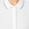100% coton piqué. Patte de boutonnage col 5 boutons. Bande de propreté contrastée encolure et fentes côtés. Finitions bord-côte avec liserés contrastés col et bas de manches. Double aiguille bas de vêtement.