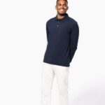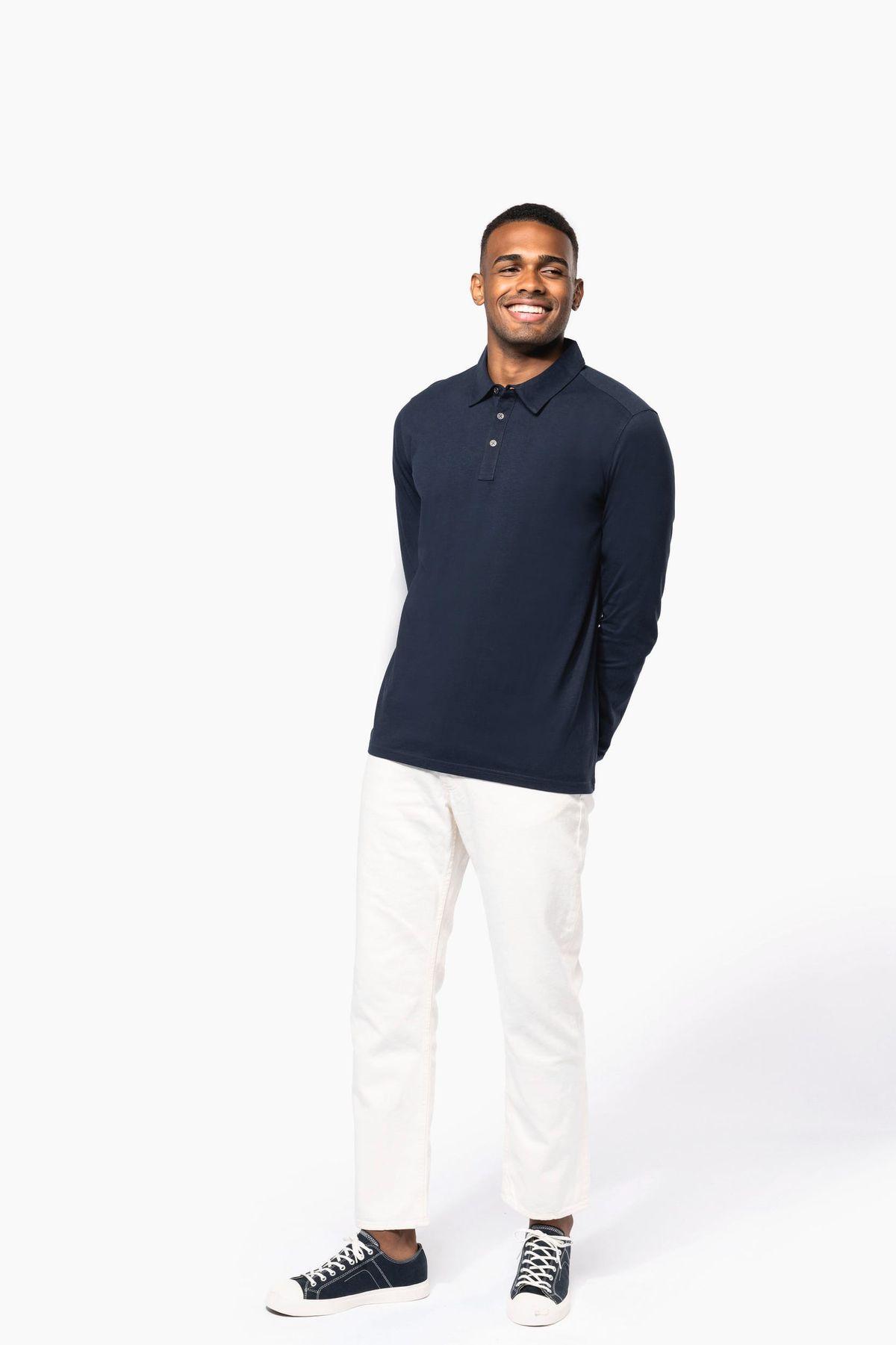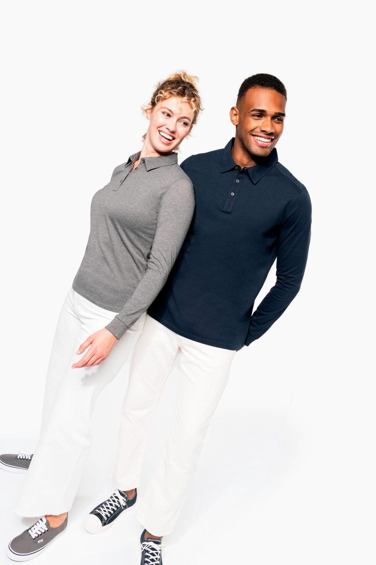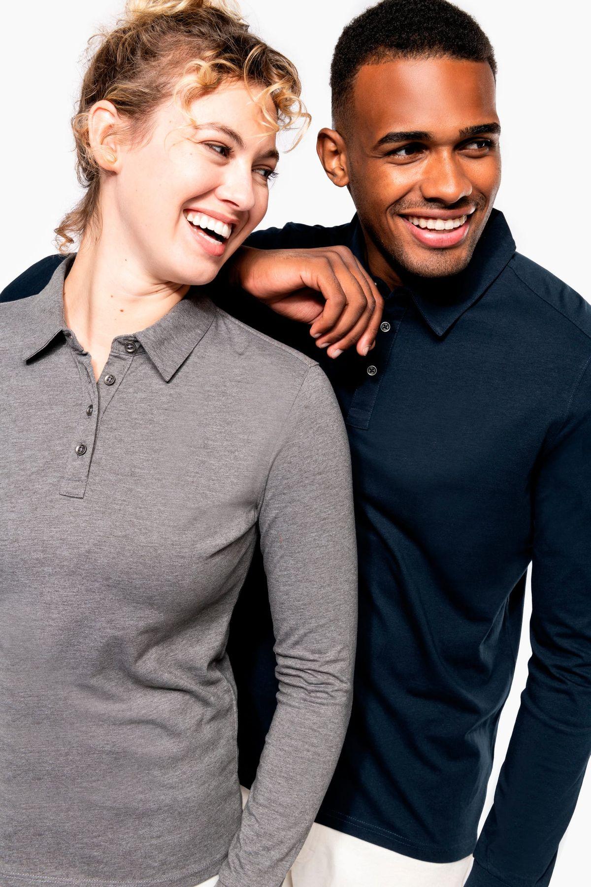 100% coton (Grey Heather : 65% polyester / 35% coton – Oxford Grey : 90% coton / 10% viscose). Maille jersey en coton peigné. Col chemise. Patte de boutonnage col 3 boutons métal. Empiècement épaule. Poignet en bord-côte. Double aiguille bas de vêtement.