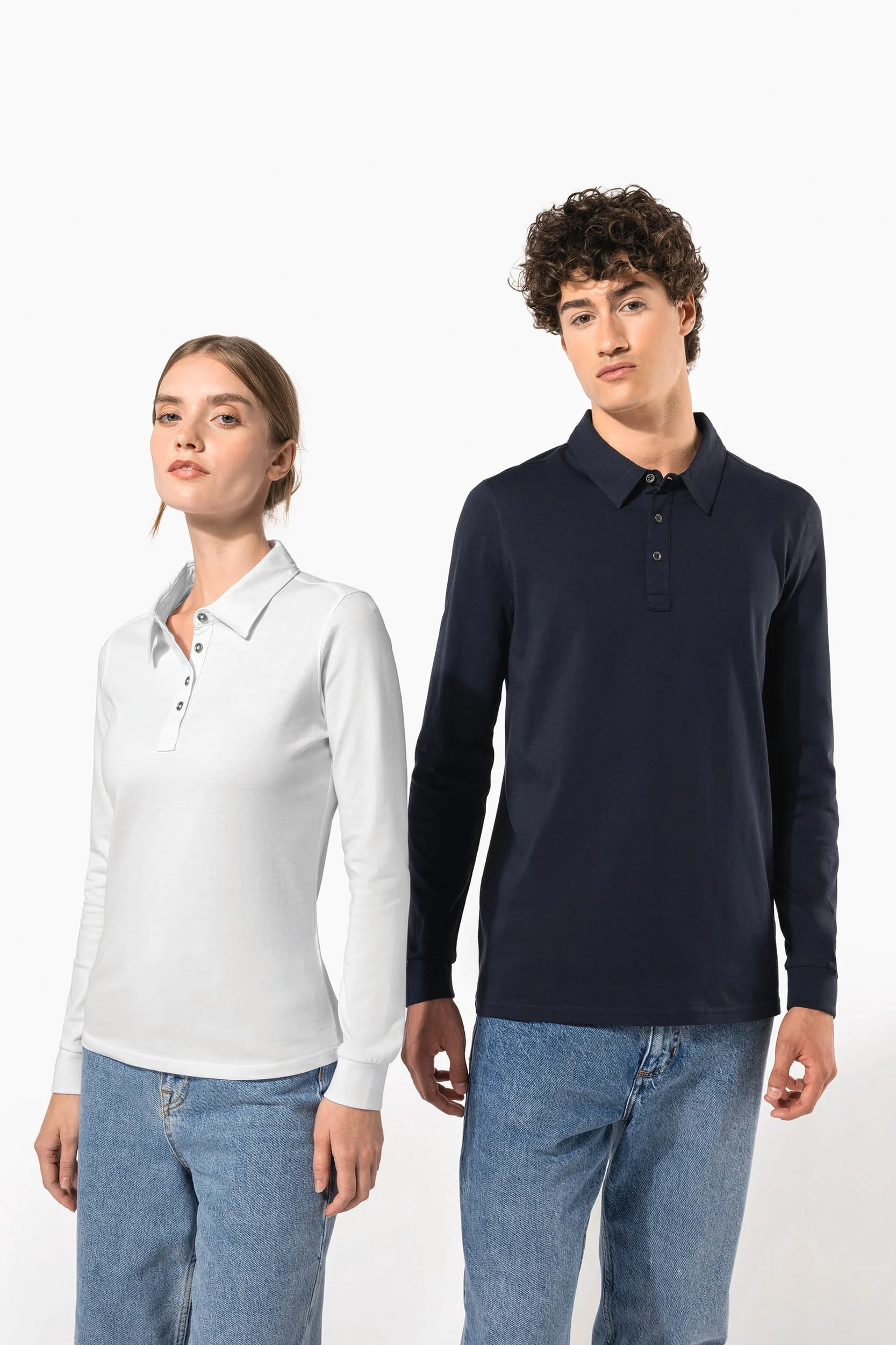 100% coton (Grey Heather : 65% polyester / 35% coton – Oxford Grey : 90% coton / 10% viscose). Maille jersey en coton peigné. Col chemise. Patte de boutonnage col 3 boutons métal. Empiècement épaule. Poignet en bord-côte. Double aiguille bas de vêtement.