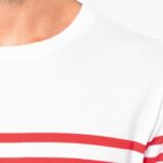 100% coton biologique. Coupe droite. Lavage aux enzymes. Encolure ronde avec bord-côte 1×1. Rayures tricotées. Bande de propreté au col. Finition double aiguille bas de manches et bas de vêtement. Pas d’étiquette de marque pour faciliter la personnalisation.