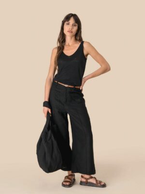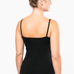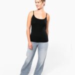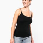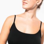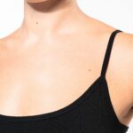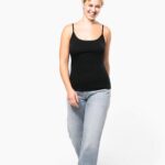 95% coton / 5% élasthanne. (Light Grey Heather : 87% coton / 9% viscose/ 4% élasthanne). Maille jersey en coton peigné. Fines bretelles et coupe féminine. Finition petit biais encolure et double aiguille au bas du vêtement.