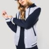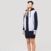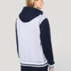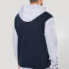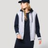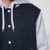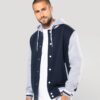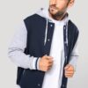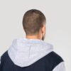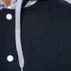 70% coton / 30% polyester. Molleton gratté 3 fils. Manches montées contrastées. Capuche en 3 parties, doublure jersey et cordons contrastés. Fermeture devant par boutons pression. Bord côte avec 2 liserés contrastés au col, manches et bas de vêtement. 2 poches passepoilées devant. Bande de propreté en chevron et boucle d’accrochage à l’intérieur col. Pas d’étiquette de marque au col, uniquement une puce de taille pour faciliter la personnalisation.