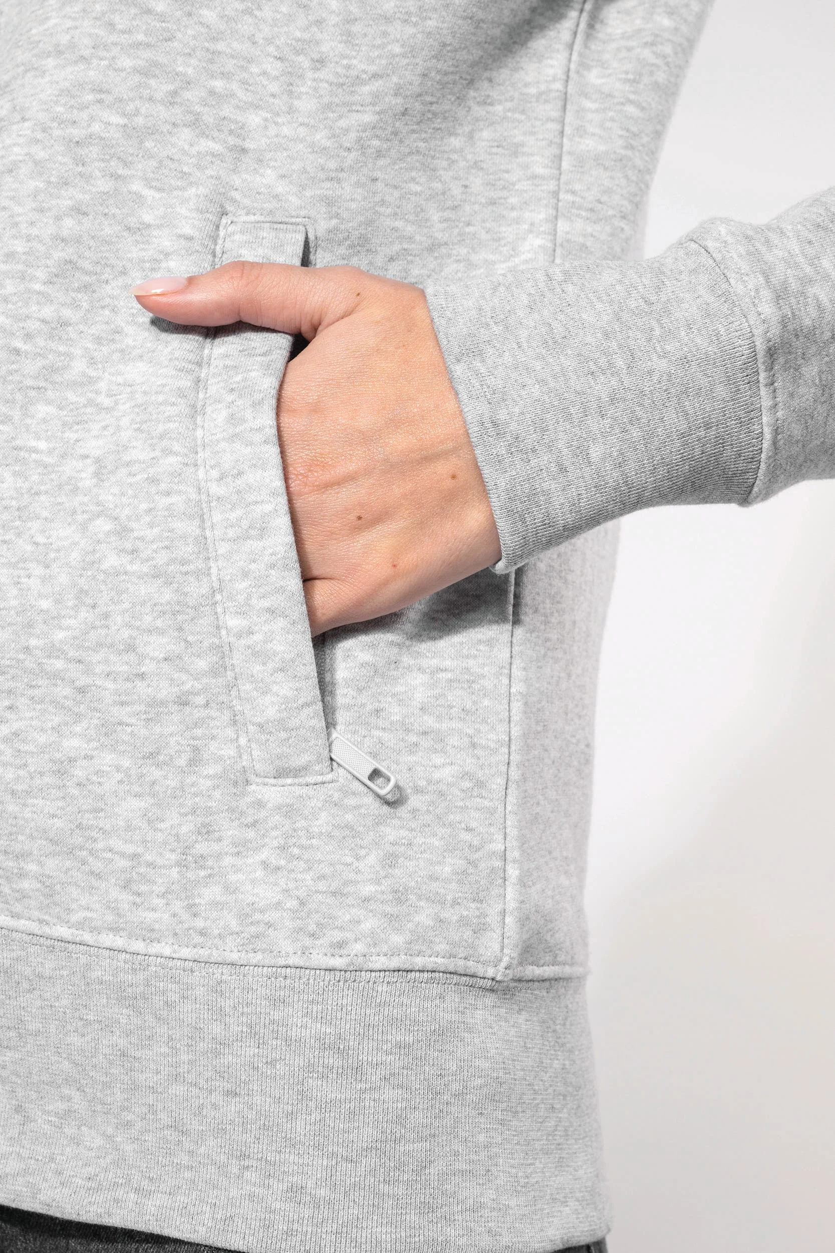 80% coton / 20% polyester. Surface extérieure 100% coton. Traitement LSF (Low Shrinkage Fleece : molleton prérétréci). Molleton gratté 3 fils en coton peigné. Coupe droite. Manches droites. Col montant. Fermeture zippée plastique ton sur ton. 2 poches zippées et passepoilées côté. Finition demi-lune à l’encolure dos pour faciliter la personnalisation de marque à l’intérieur col. Finition bord-côte 1×1 bas de manches et de vêtement. Etiquette de marque Tear Away.