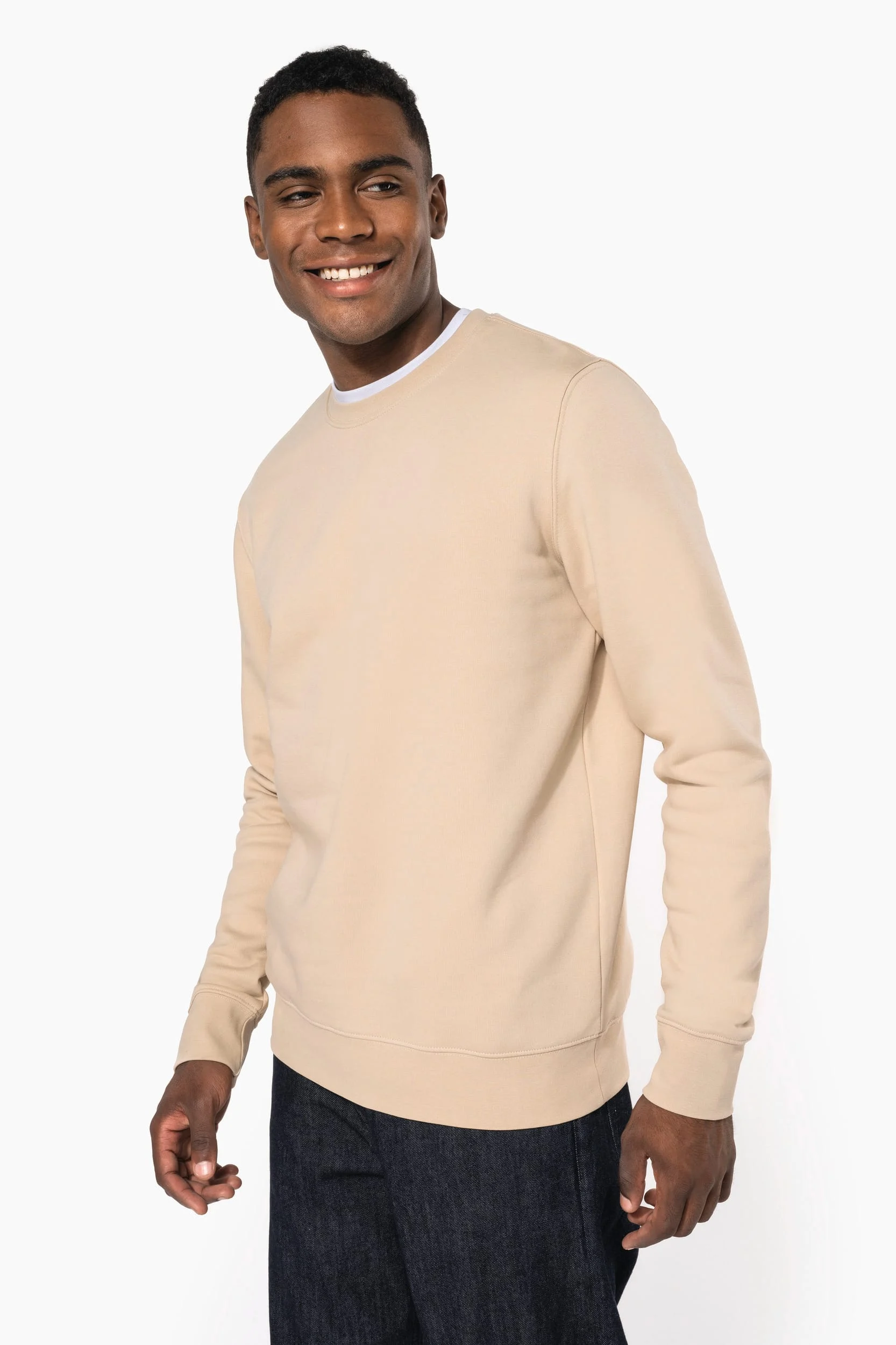 85% coton biologique / 15% polyester recyclé post-consumer. Surface extérieure 100% coton peigné. Molleton gratté 3 fils LSF (Low Shrinkage Fleece). Lavage aux enzymes. Coupe droite. Bord-côte 1×1 montage tubulaire pour une meilleure finition au col, bas de manches et de vêtement. Bande de propreté jersey ton sur ton et finition demi-lune intérieur col. Finition double aiguilles sur bas de manches, bas de vêtement et col. Pas d’étiquette de marque au col, uniquement une puce de taille pour faciliter la personnalisation.