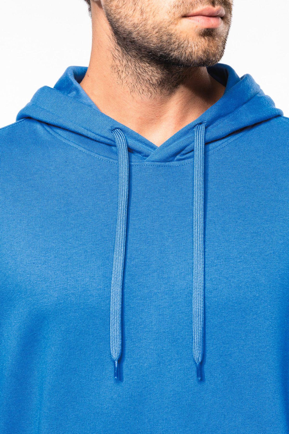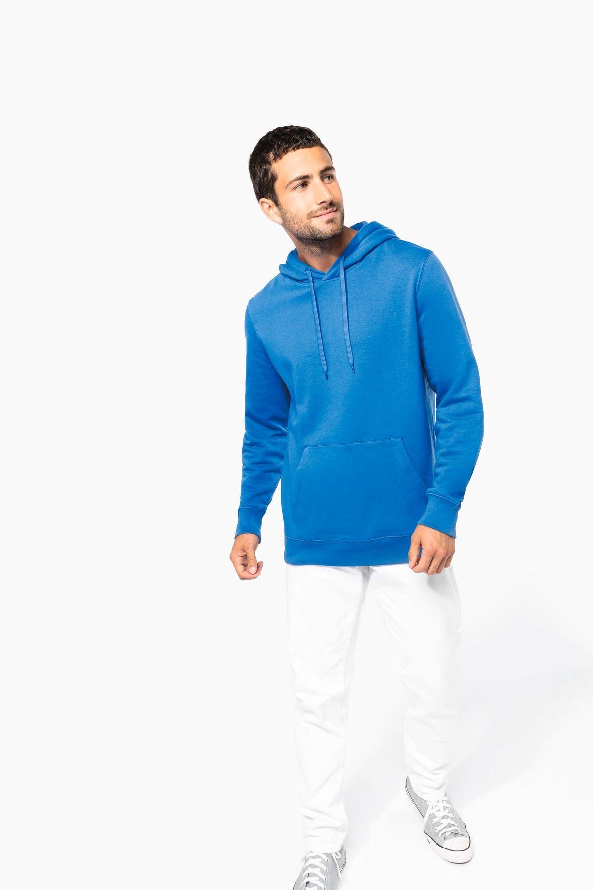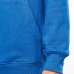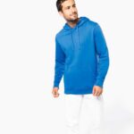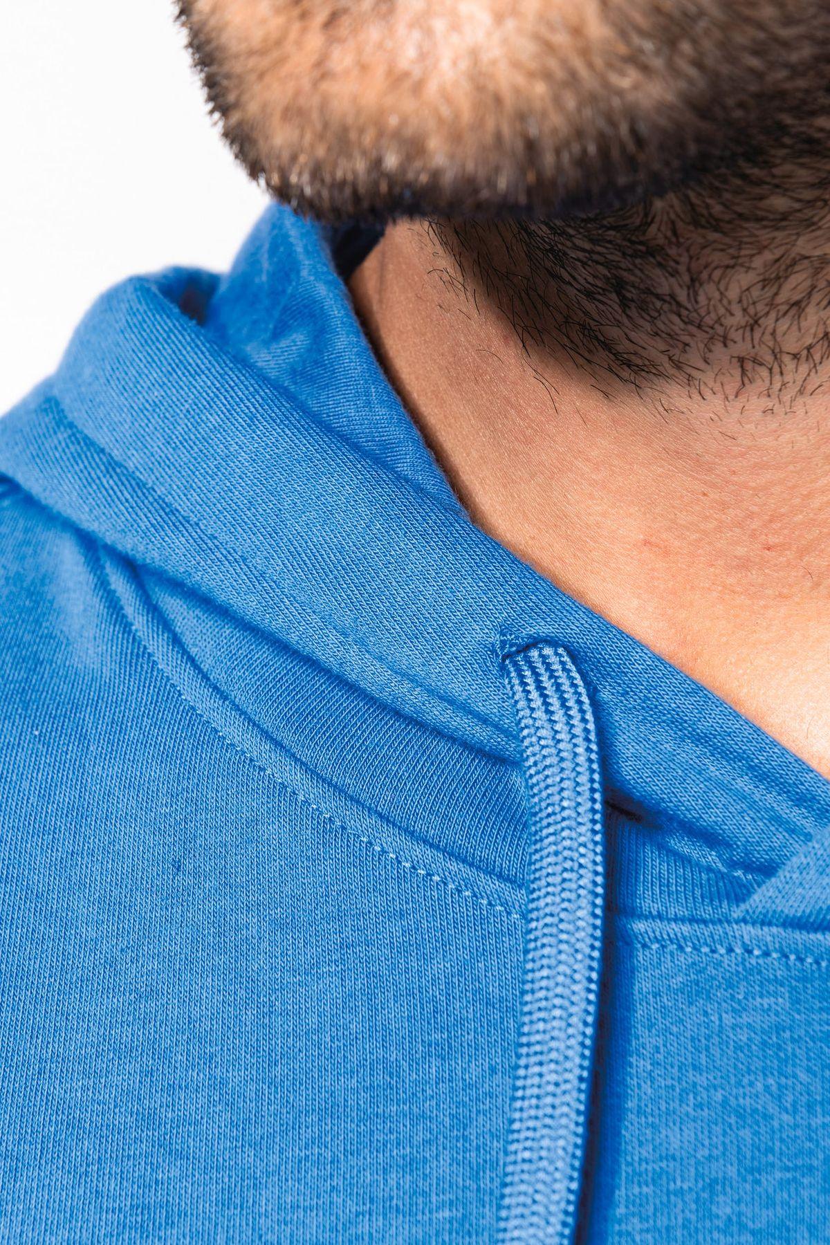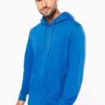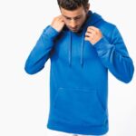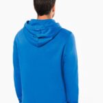 80% coton / 20% polyester. Tissu molleton gratté LSF 3 fils (Low Shrinkage Fleece) avec traitement antiboulochage. Fabriqué au Portugal. Coupe straight. Montage coupé cousu. Bord-côte 1×1 montage tubulaire pour une meilleure finition au bas de manches et de vêtement. Poche kangourou. Capuche doublée 100% coton jersey avec cordon de serrage plat œillets boutonnières. Finition demi-lune intérieur col. Finition double aiguille sur bas de manches, bas de vêtement. Pas d’étiquette de marque au col, uniquement une puce de taille pour faciliter la personnalisation.
