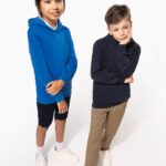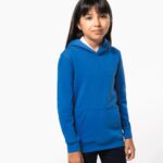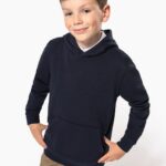 80% coton / 20% polyester. Coton peigné. Tissu molleton gratté 3 fils LSF (Low Shrinkage Fleece) avec traitement anti boulochage. Fabriqué au Portugal. Coupe ajustée. Bas de manches et de vêtement en bord-côte 1×1. Capuche doublée en coton jersey. Finition double surpiqûres sur épaule, emmanchures, bas de manches et de vêtement. Bande de propreté en jersey ton sur ton en finition intérieur de col. Poche kangourou. Demi lune au dos. Etiquette pour mentionner le prénom à intérieur du vêtement. Pas d’étiquette de marque au col, uniquement une puce de taille pour faciliter la personnalisation.