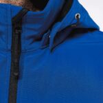 95% polyester/ 5% élasthanne. Tissu contrecollé 3 couches respirant. 3000 g/m² /24 h et imperméable 8000 mm. Extérieur : 95% polyester/ 5% élasthanne. Intermédiaire : membrane respirante. Couche intérieure : micropolaire. Tissu facilitant l’impression. Coupe ajustée. Fermeture zippée. 2 poches zippées sur le devant et une poche zippée devant côté droit au porter. Capuche amovible à l’aide de boutons pression et cordon de serrage. Manches amovibles à l’aide d’un zip. Finition double aiguille au bas de manche et de vêtement.