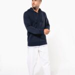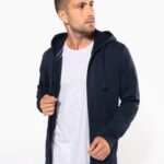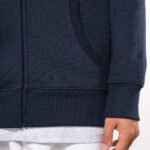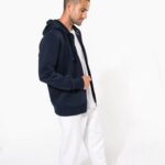 80% coton / 20% polyester (Ash Heather : 79% coton / 20% polyester / 1% viscose). Surface extérieure 100% coton peigné. Molleton gratté 3 fils avec traitement LSF (Low Shrinkage fleece). Bande de propreté contrastée à l’encolure (Navy pour le coloris Oxford Grey et Ash Heather ; Oxford Grey pour tous les autres coloris). Capuche doublée en nid d’abeille avec cordon de serrage. Poches kangourou. Finition bord-côte entrée de poches, bas de manches et bas de vêtement. Fermeture zippée.