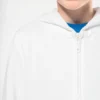 80% coton / 20% polyester. Coton peigné. Molleton gratté. Bande de propreté contrastée à l’encolure. Capuche doublée en nid d’abeille. Poches kangourou. Finition bord-côte entrée de poches, bas de manches et bas de vêtement. Fermeture zippée.