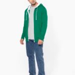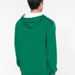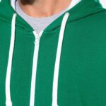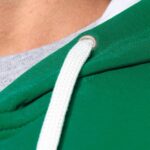 80% coton / 20% polyester. Coton peigné. Molleton gratté. Passe fil écouteurs dans la poche kangourou et encolure. Bord-côte bas de manches et de vêtement. Capuche doublée et contrastée avec cordon de serrage. Zip contrasté.