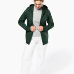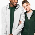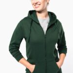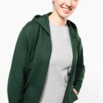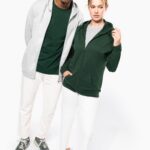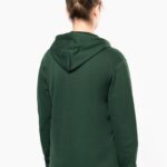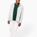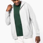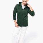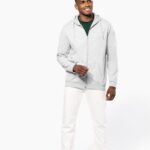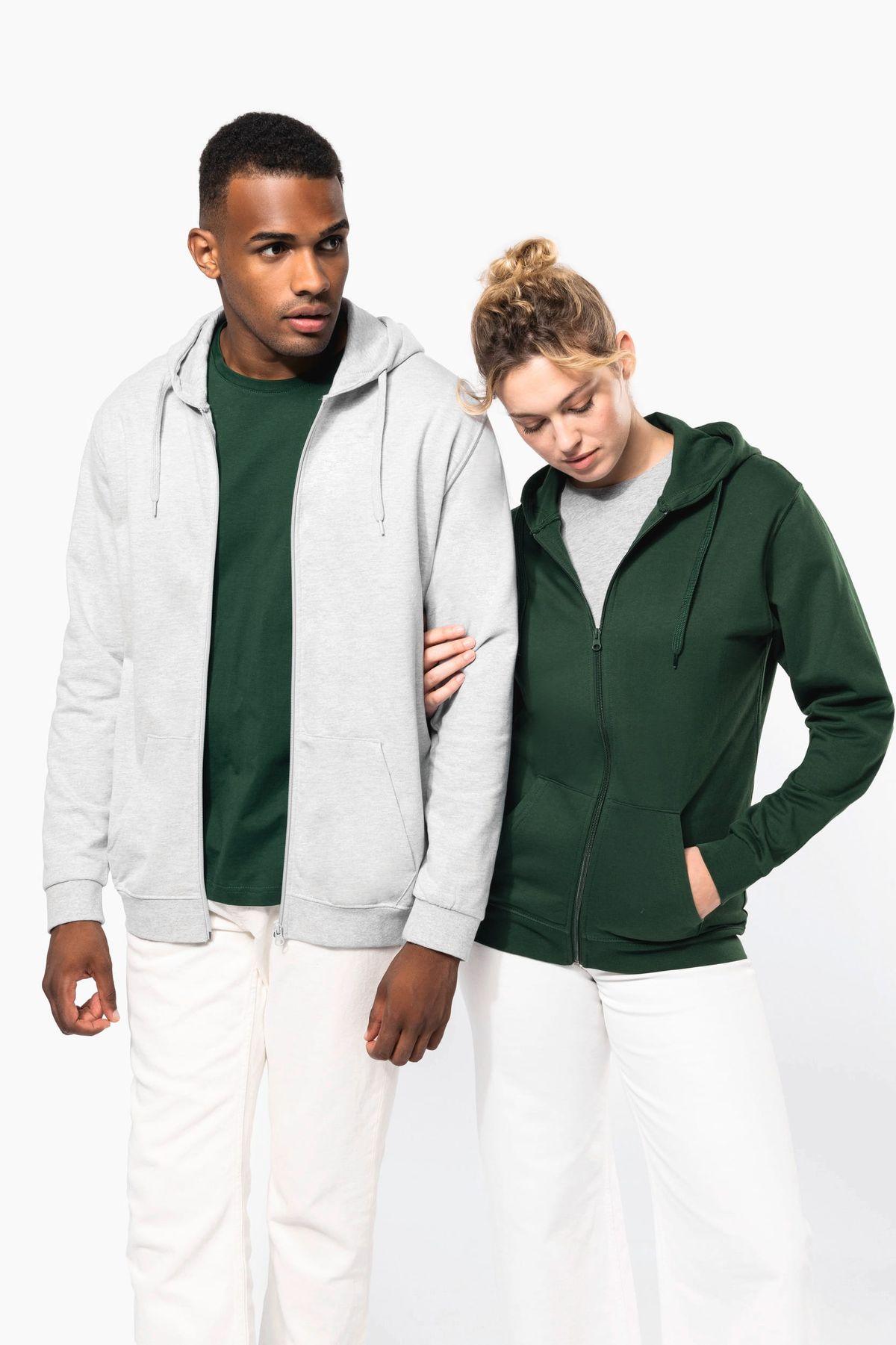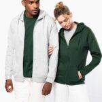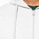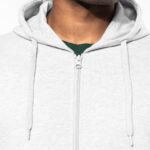 80% coton / 20% polyester. Coton peigné. Molleton gratté. Manches montées. Fermeture zippée nylon. Capuche doublée avec cordon de serrage ton sur ton. Poches Kangourou. Finition bord-côte bas de manches et de vêtement.