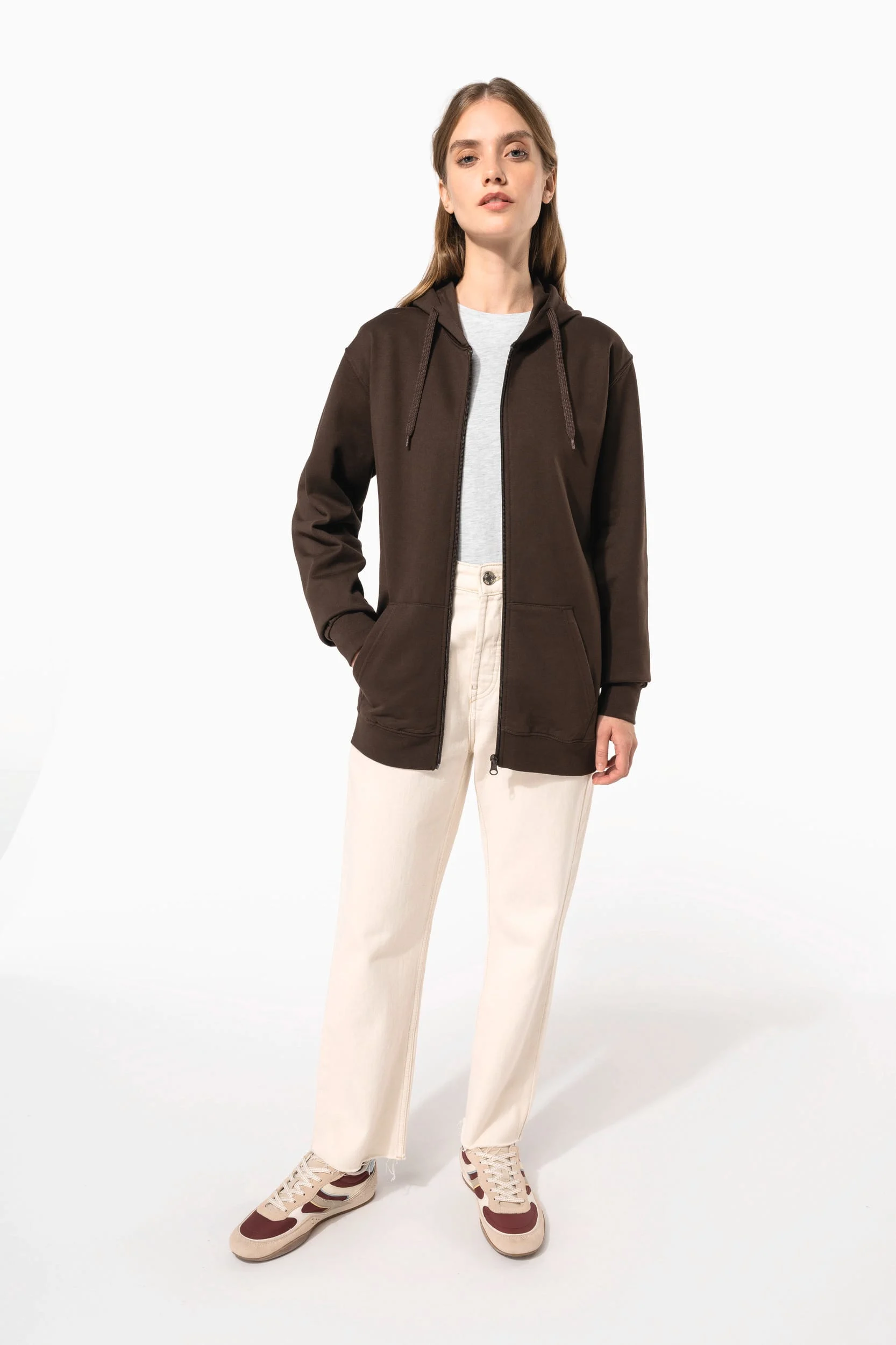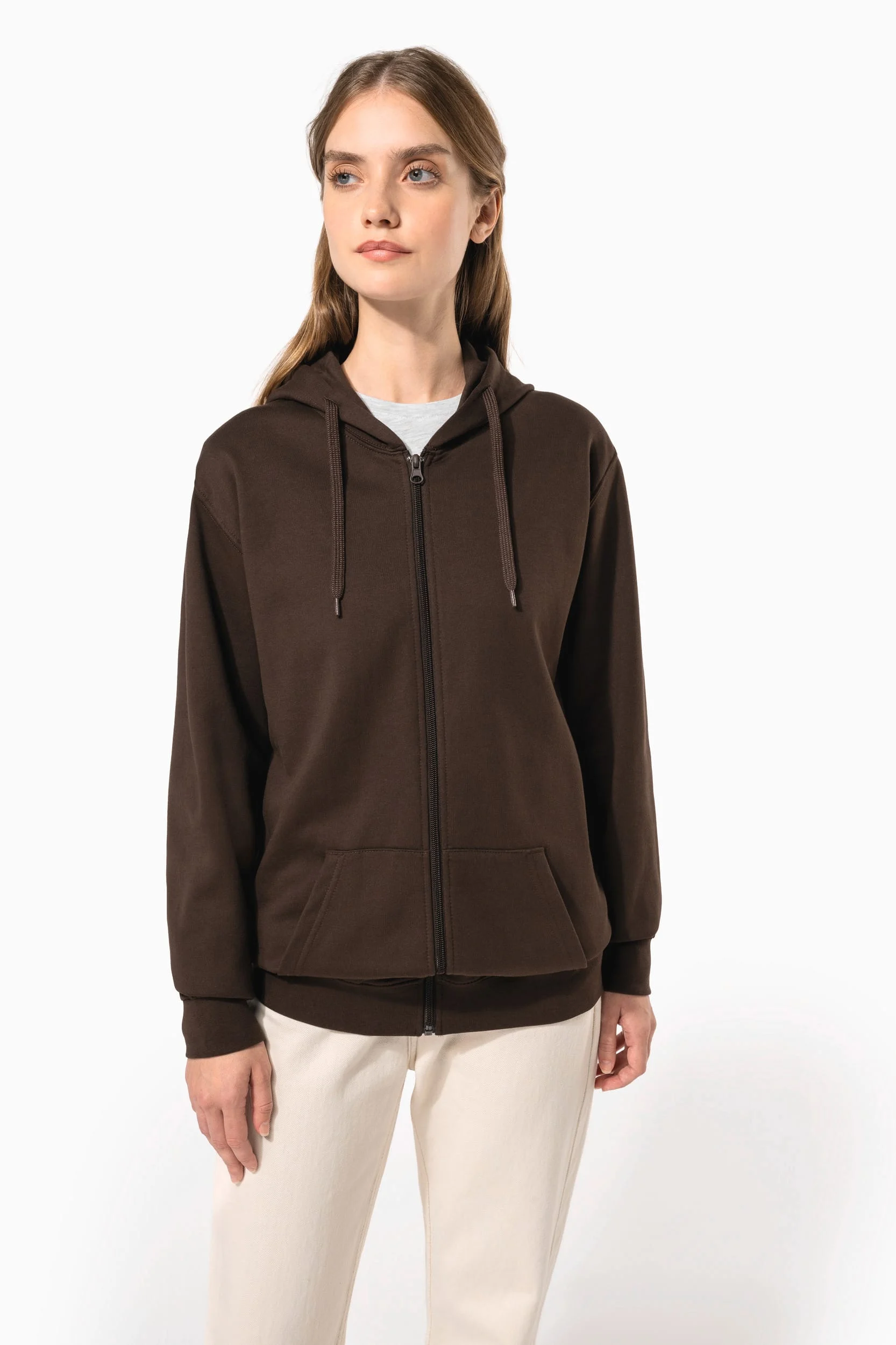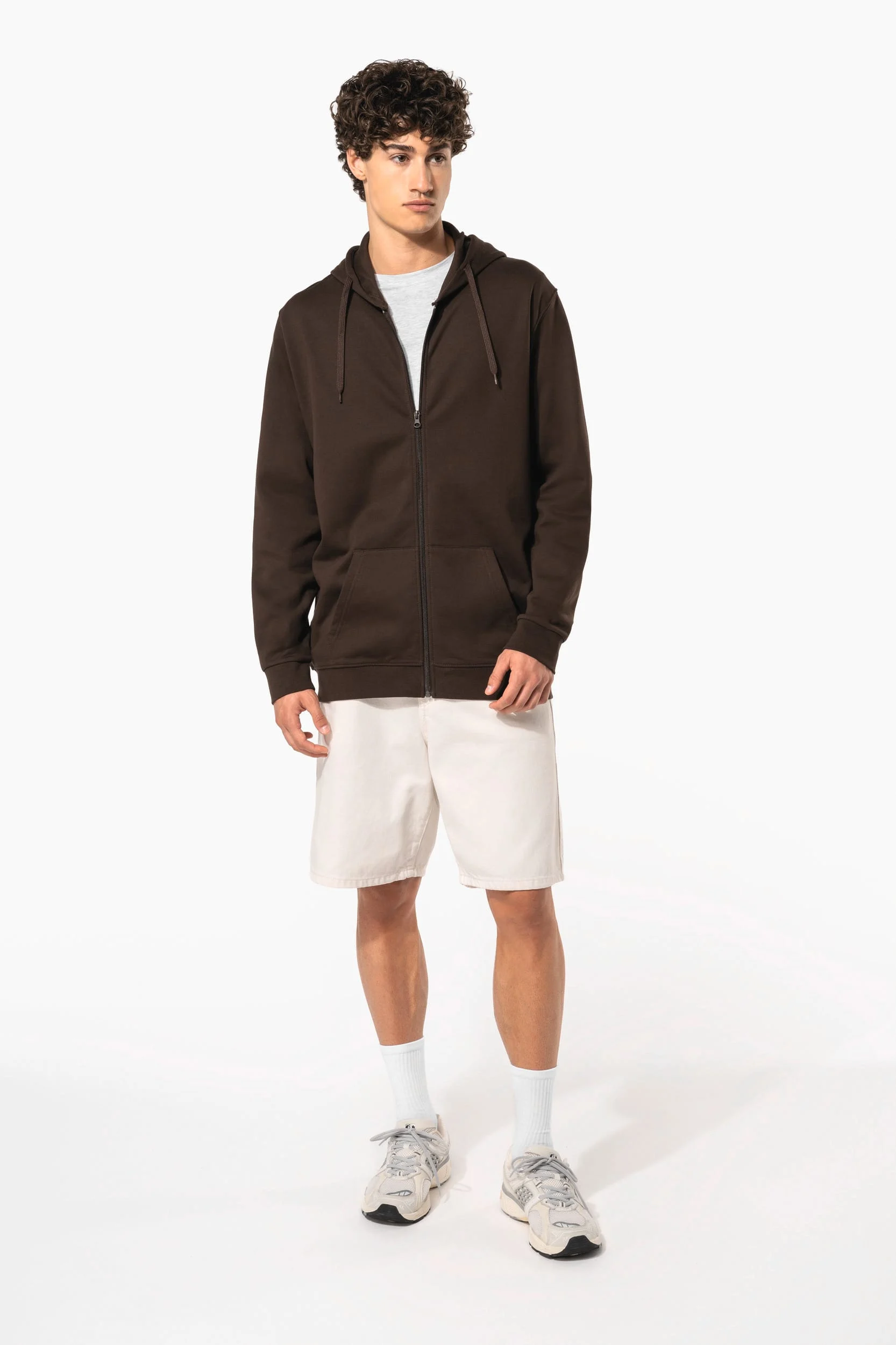 80% coton / 20% polyester. Coton peigné. Molleton gratté. Manches montées. Fermeture zippée nylon. Capuche doublée avec cordon de serrage ton sur ton. Poches Kangourou. Finition bord-côte bas de manches et de vêtement.