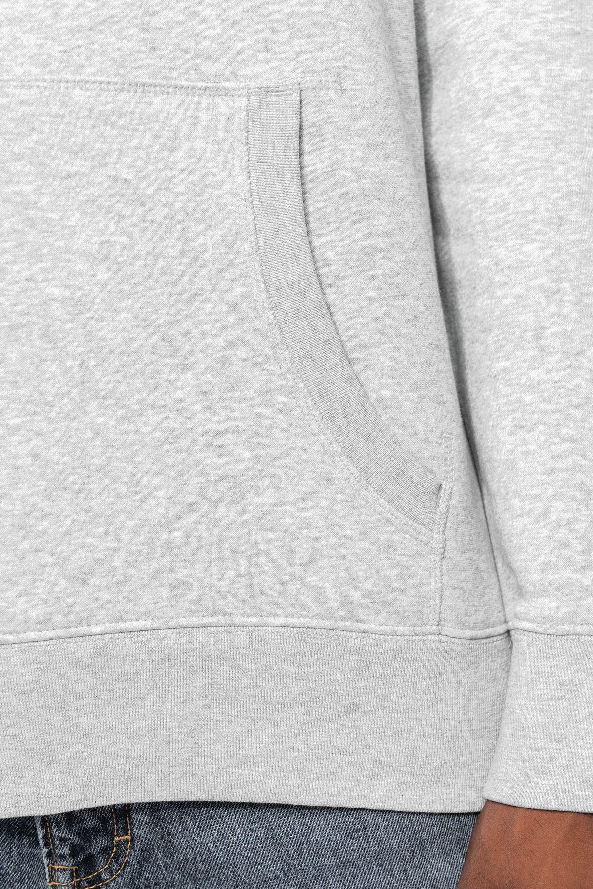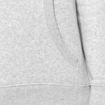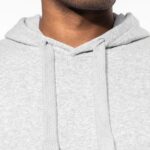 80% coton / 20% polyester (Ash Heather : 79% coton / 20% polyester / 1% viscose). Surface extérieure 100% coton. Traitement LSF (Low Shrinkage Fleece : molleton prérétréci). Molleton gratté 3 fils en coton peigné. Manches montées. Bande de propreté contrastée à l’encolure (Navy pour le coloris Oxford Grey et Ash Heather ; Oxford Grey pour tous les autres coloris). Capuche doublée en nid d’abeille avec cordon de serrage. Poches kangourou. Finition bord-côte poignets et de bas de vêtement.