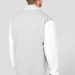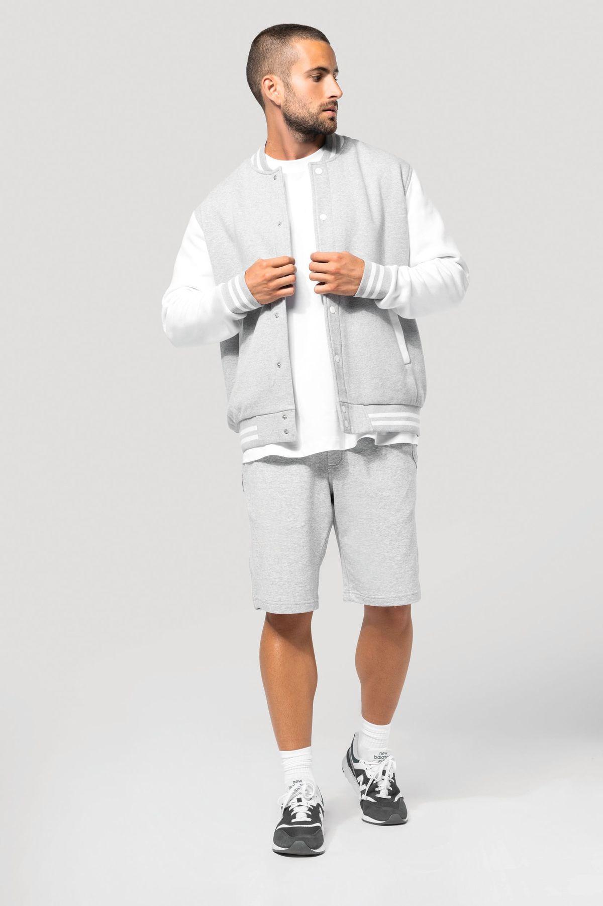70% coton / 30% polyester. Molleton gratté 3 fils. Manches montées contrastées. Fermeture devant par boutons pression contrastés. Bord-côte avec 2 liserés contrastés au col, manches et bas de vêtement. 2 poches passepoilées contrastées devant. Bande de propreté en chevron et boucle d’accrochage à l’intérieur col. Pas d’étiquette de marque au col, uniquement une puce de taille pour faciliter la personnalisation.
