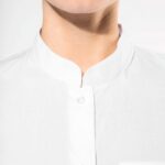 65% polyester / 35% coton popeline. Entretien facile. Col mao non boutonné. Boutons ton sur ton. Poche poitrine côté gauche en V. Poignet réglable à angles arrondis avec patte de manche indéchirable. 1 bouton de rappel. Bas arrondi.