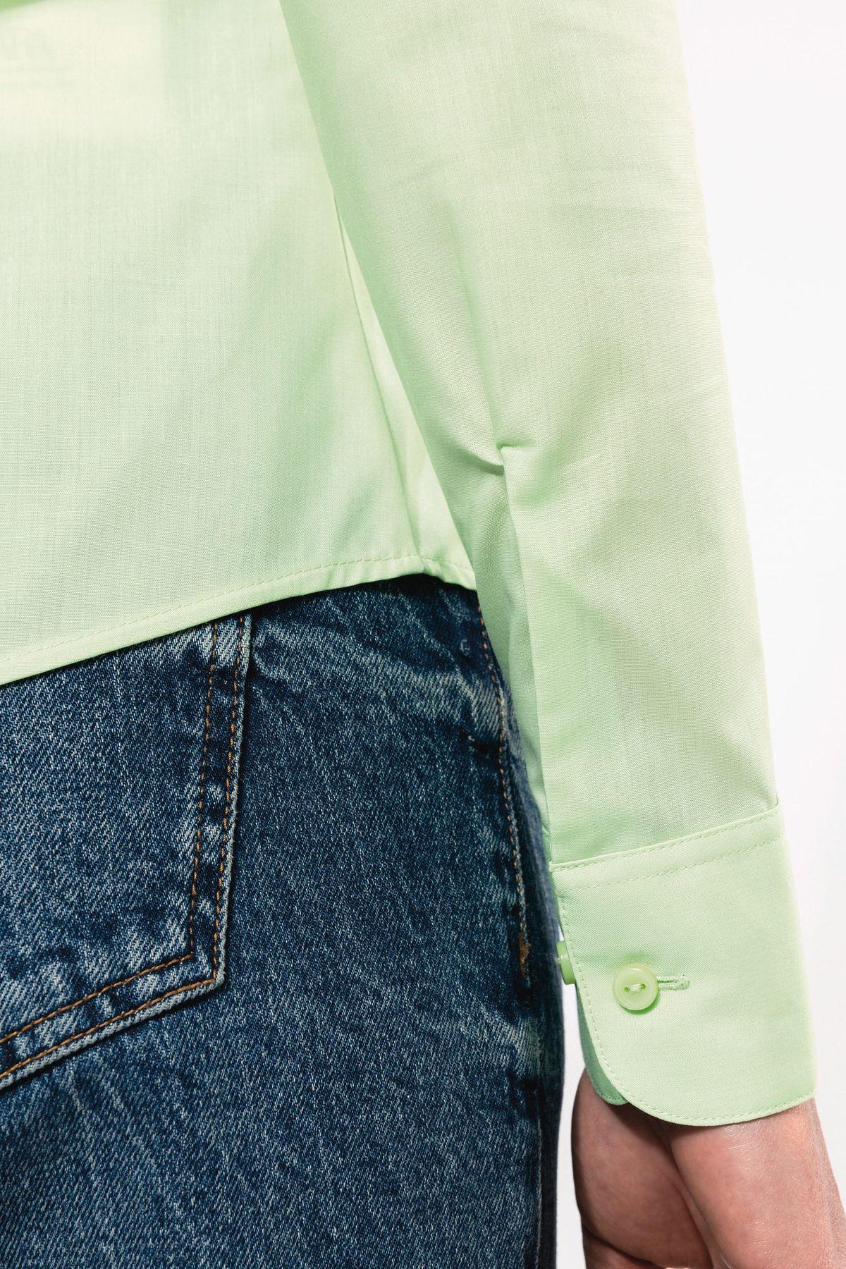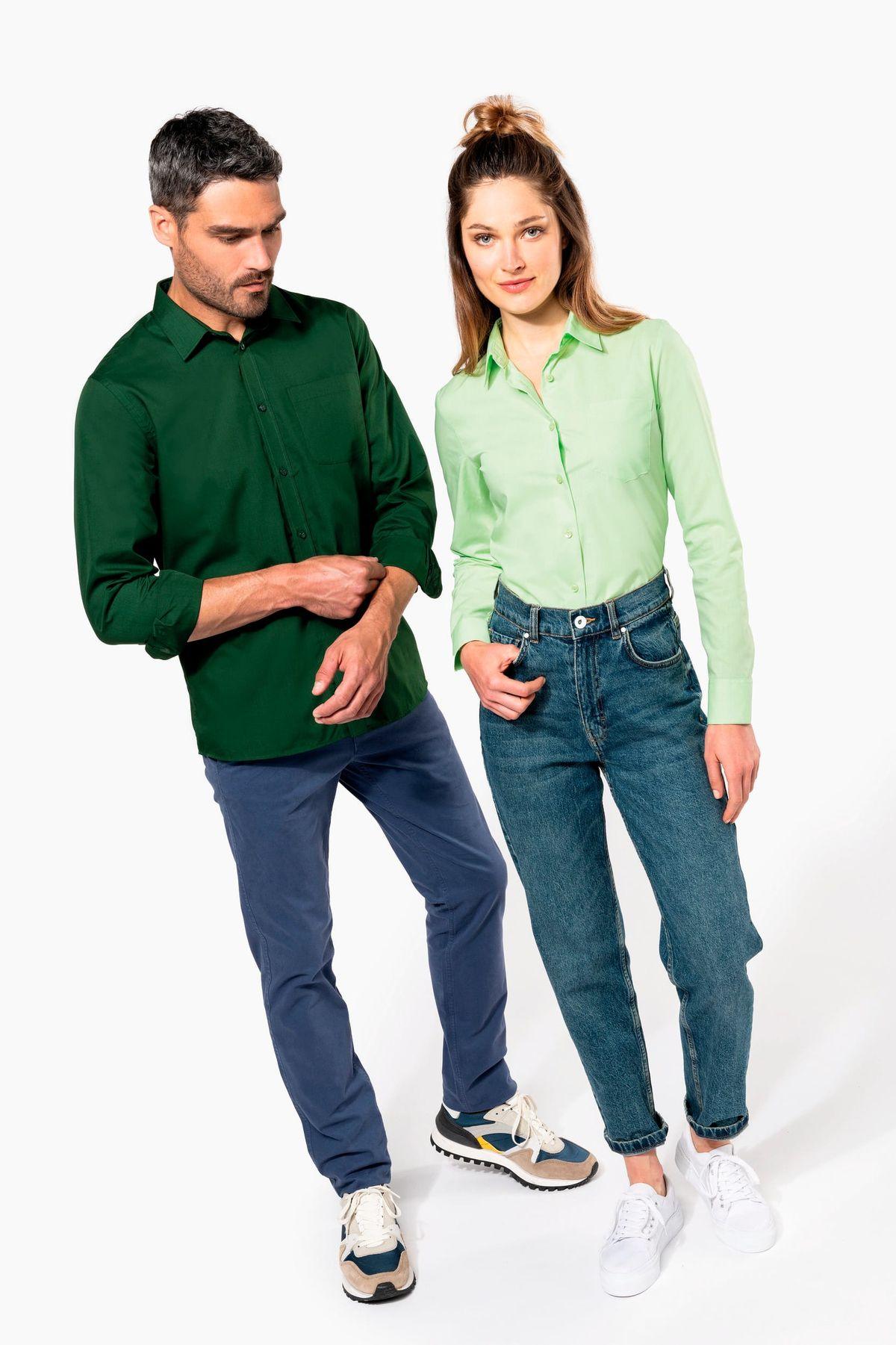 65% polyester / 35% coton. Tissu popeline. Entretien facile. Col non boutonné. Boutons ton sur ton. Poche poitrine côté gauche en V. Poignet réglable à angles arrondis avec patte de manche indéchirable. 1 bouton de rappel. Bas arrondi.